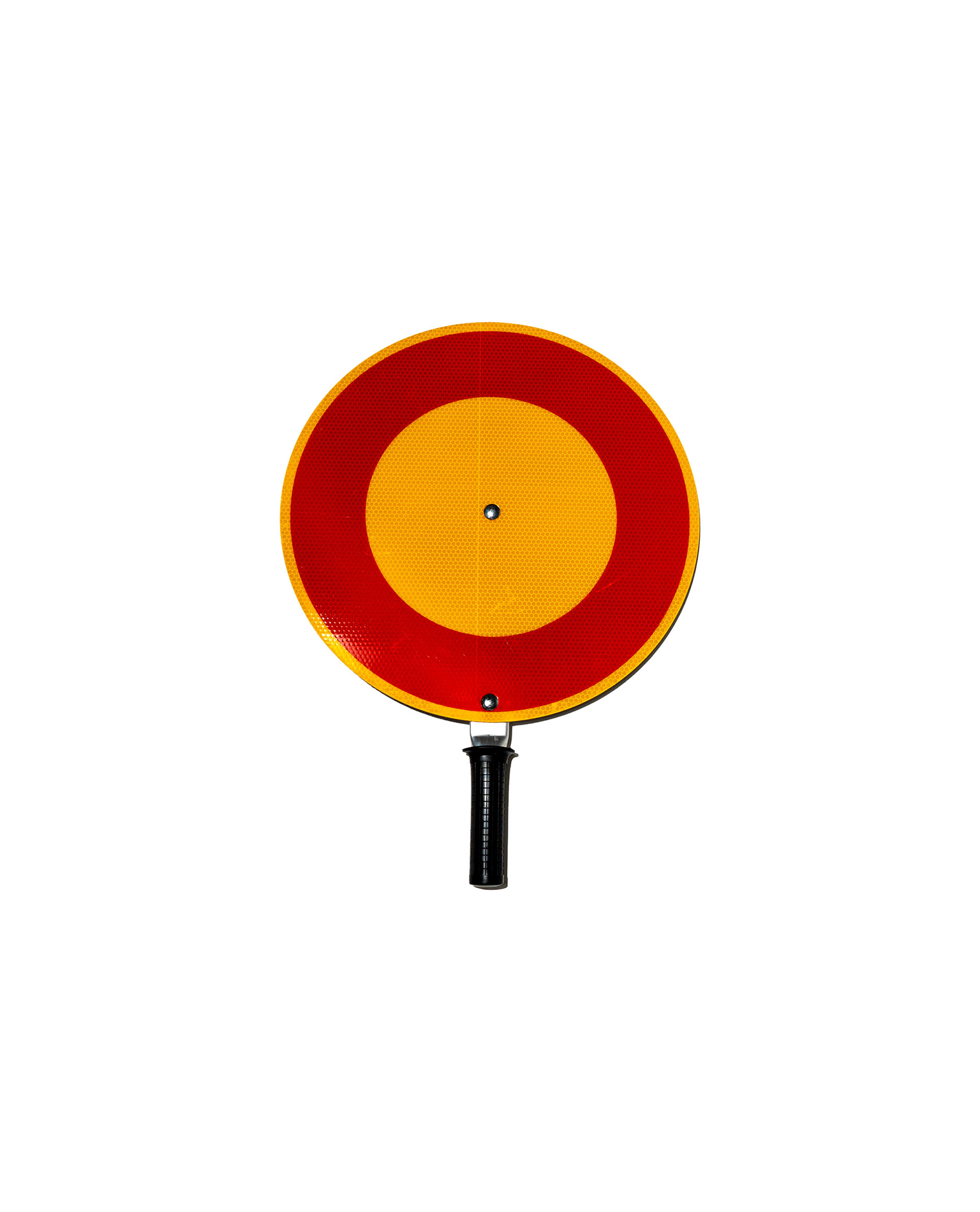 Suurikokoinen liikenteenohjaajan pysäytysmerkki päiväloistekalvolla. Alumiinivarsi, jossa kuminen kädensija.