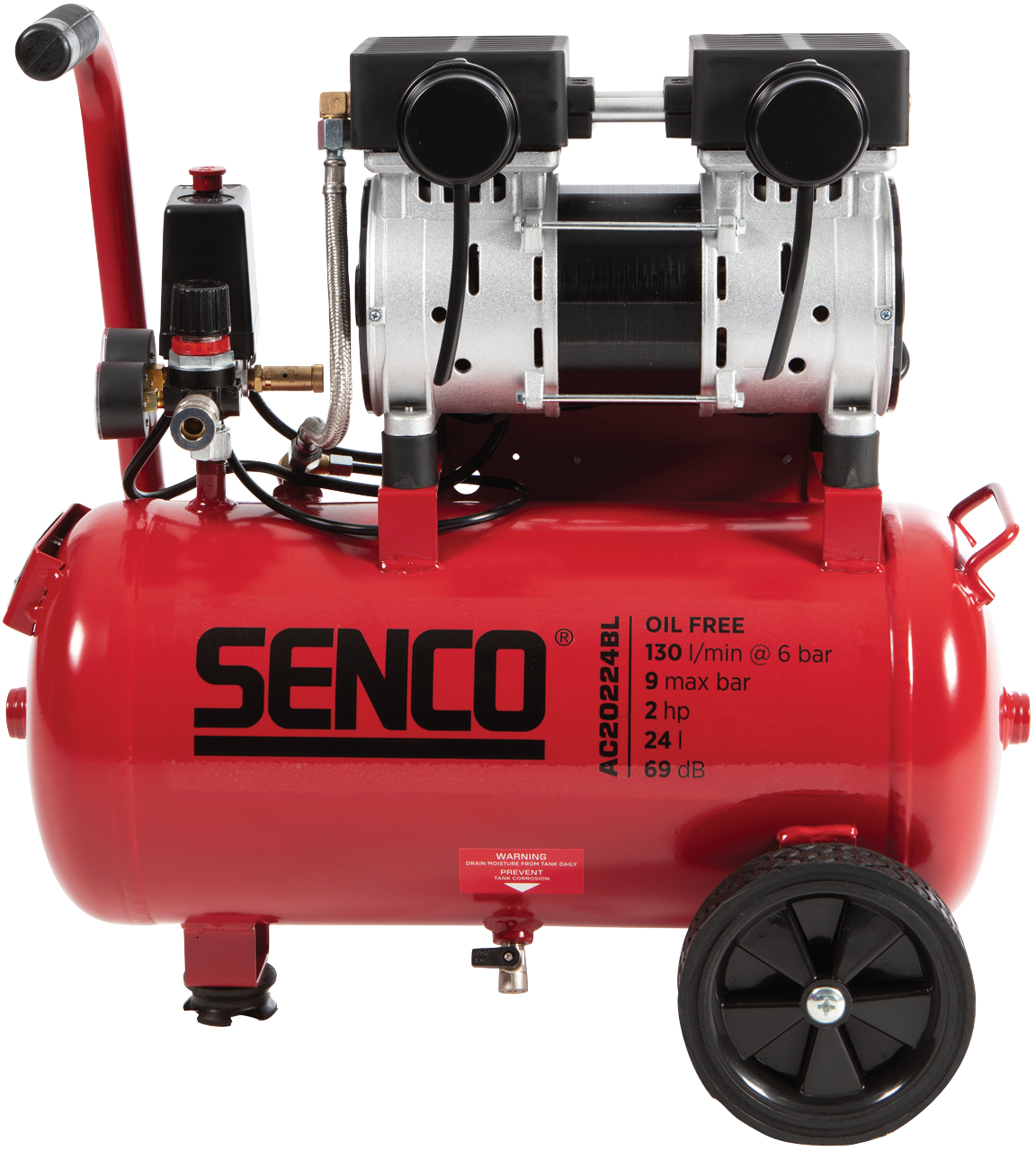 SENCOn 24 litran kompressorissa yhdistyvät teho ja siirrettävyys. Tukevat kumipyörät ja mukava kahva takaavat kompressorin helpon kuljetuksen. Vaakasuuntainen säiliö lisää vakautta kauttaaltaan. Soveltuu erilaisiin yleisiin sisä- ja ulkokäyttökohteisiin.