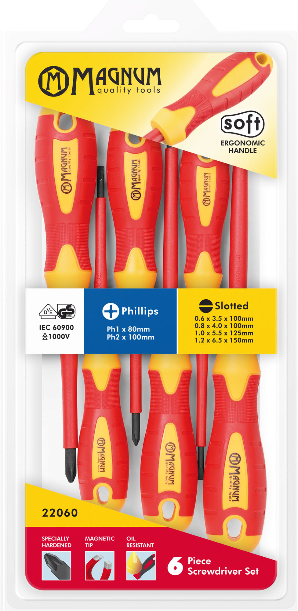 Kuusiosainen sarja jännitteenalaiseen työskentelyyn virallisesti VDE:n tyyppihyväksymiä Phillips- ja uraruuvitalttoja. Ergonomisesti muotoiltu ja erittäin pitävä kumipintainen Soft-kädensija. Varsi on valmistettu korkealaatuisesta kromivanadiiniteräksestä. Erikoiskarkaistu ja magnetisoitu kärki, jossa musta fosfatoitu pintakäsittely. Suurikokoinen reikä kädensijassa mahdollistaa ruuvitaltan ripustamisen.