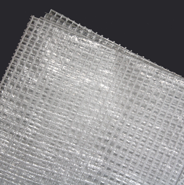 Verkkorakenteinen telinepeite, jossa on vahvikenauhat ja reiät 10 cm:n välein. Peite on taiteltu ja pakattu muovikääreeseen. Neliöpaino noin 170 g.
